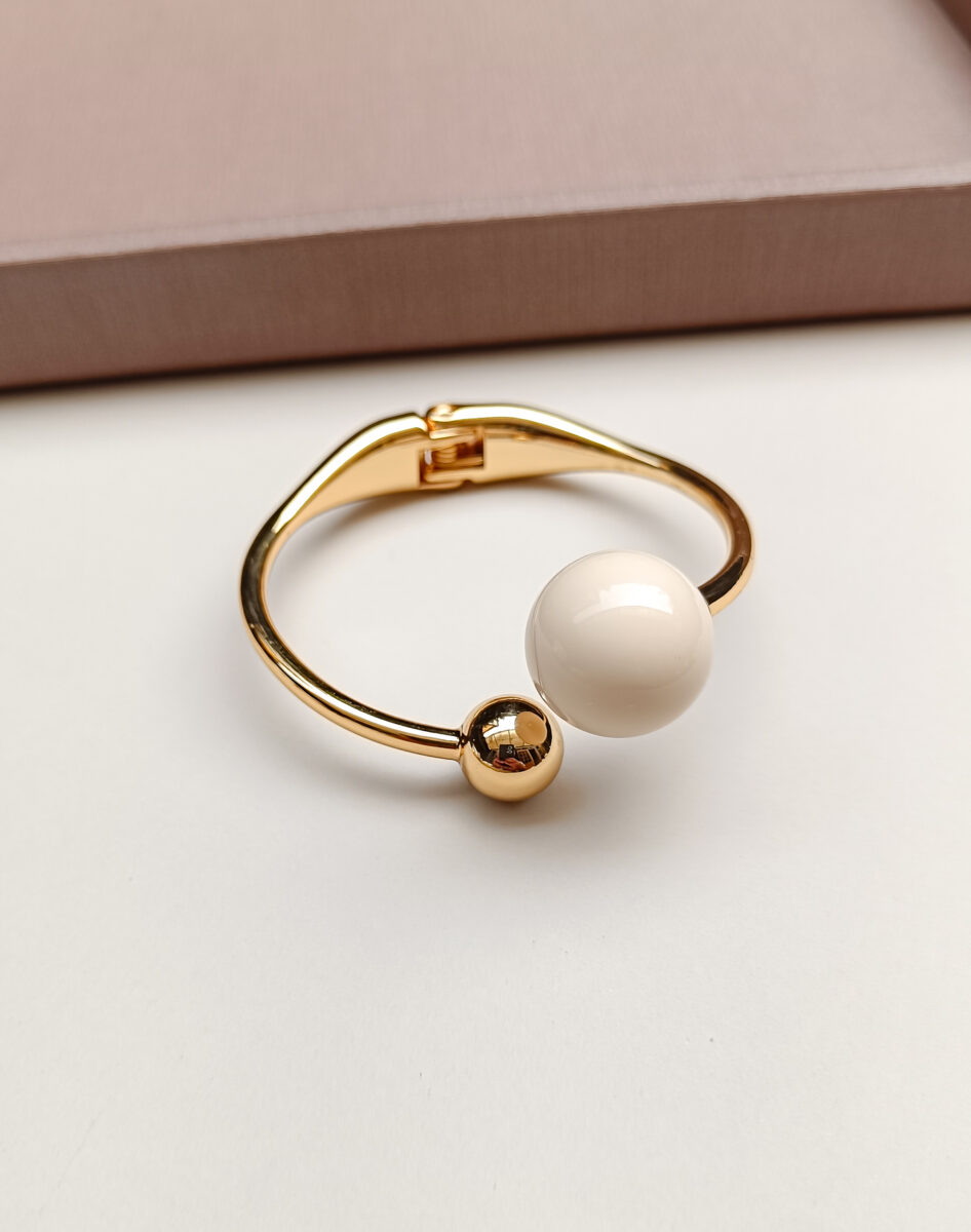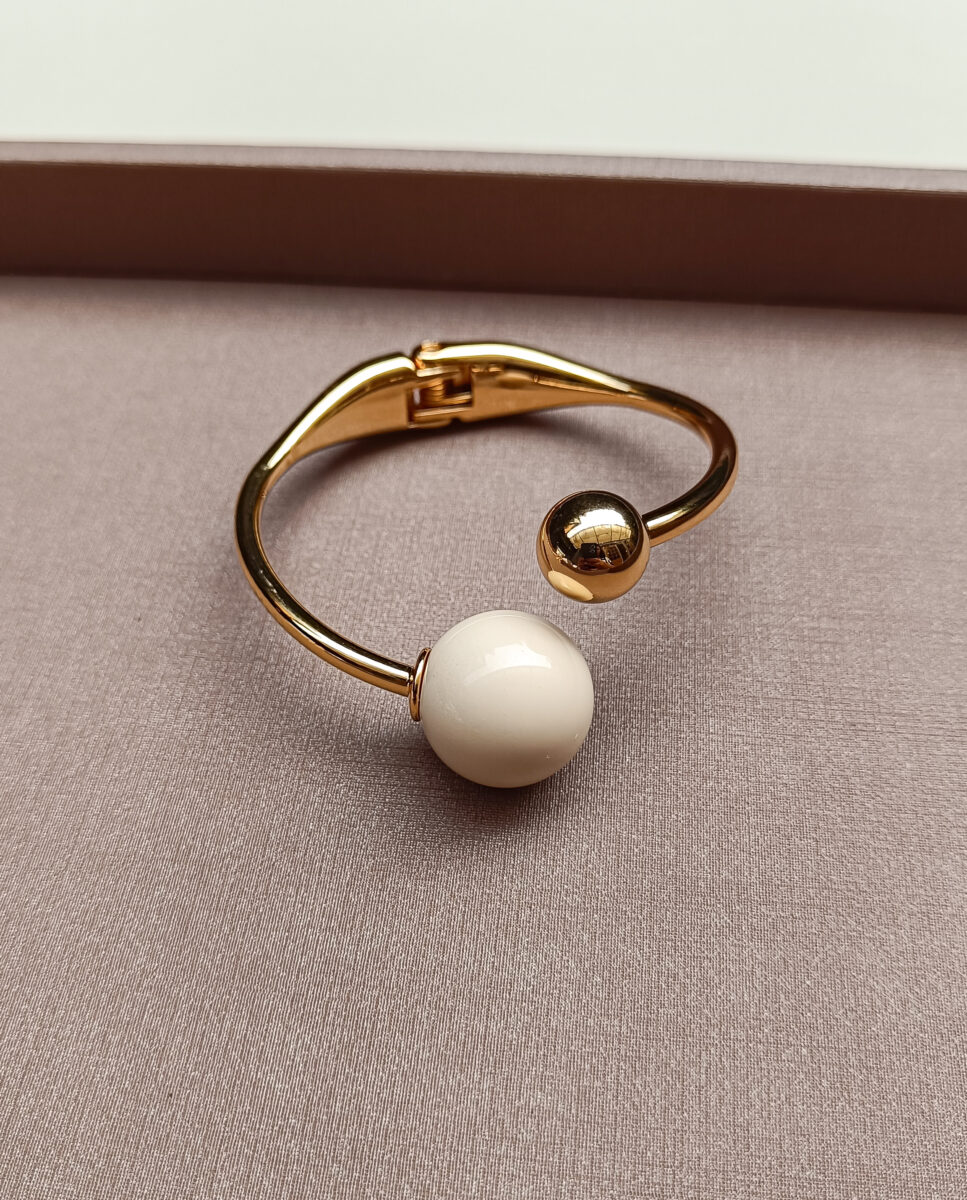 O Bracelete Esferas Solar segue o mesmo estilo marcante da gargantilha Solar, com design moderno e cheio de personalidade. Com estrutura em metal e formato arredondado, o destaque está nas duas esferas na parte frontal, uma em metal dourado e outra em resina. O sistema de abertura com mola garante praticidade no uso e um encaixe confortável no pulso.