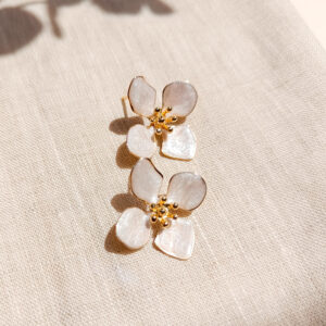 O Brinco Camélia é uma peça marcante em forma de flor, com cinco pétalas delicadamente moldadas em metal e um detalhe central em pérola que traz um toque clássico e atemporal. Um brinco que une charme e leveza, ideal para quem aprecia beleza nos detalhes.