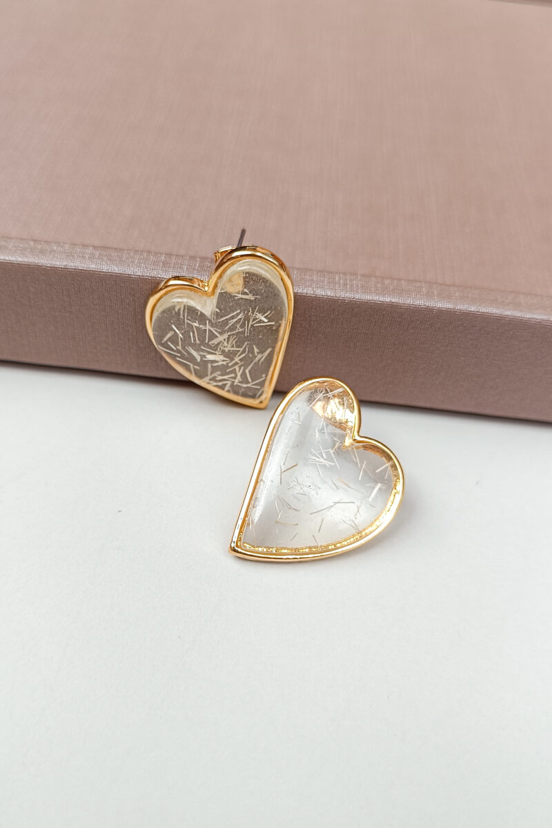 Brinco em forma de coração com borda em metal e aplique de resina.