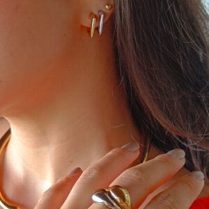 Este brinco traz um design elegante e moderno, com uma base alongada em curvas que se conecta a um pingente oval, criando um visual harmônico e sofisticado. A combinação de tons dourado e prata adiciona um charme especial, tornando-o uma peça versátil para diversas ocasiões.
